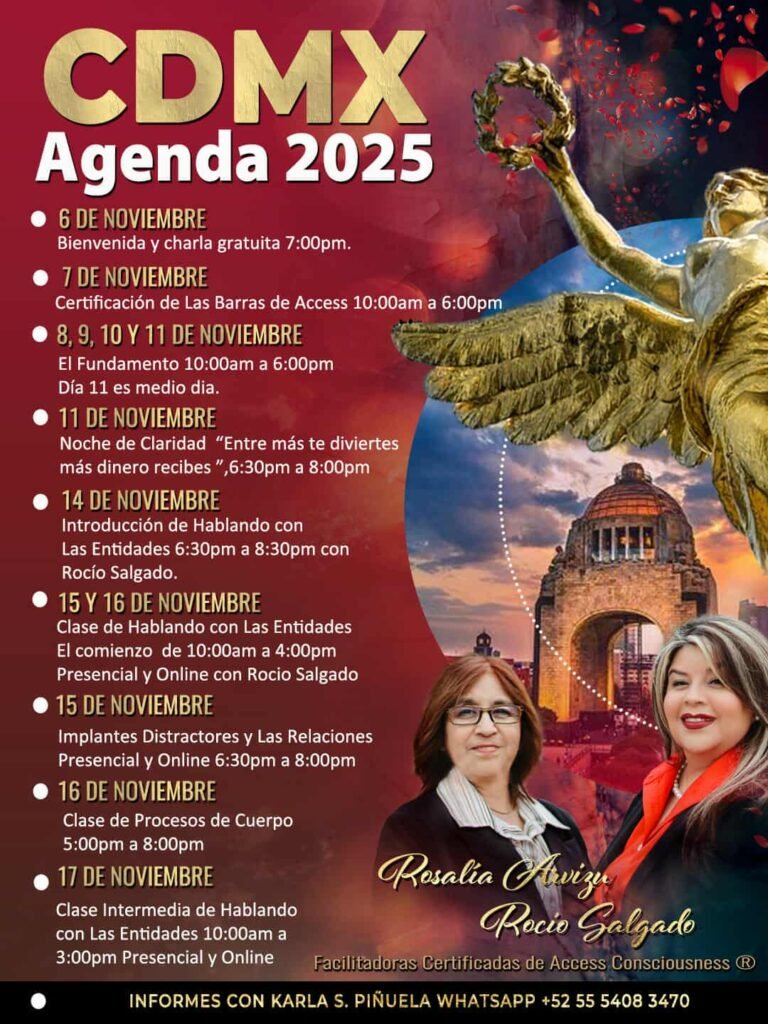 ¡Hola a todos! 👋 Estoy muy emocionada de anunciarles mi próxima visita a Ciudad de México este mes de noviembre. Estaré compartiendo una serie de clases y talleres de Access Consciousness® junto a Rocío Salgado. Será una oportunidad maravillosa para crecer, aprender y descubrir nuevas posibilidades juntos. ¡Me encantaría que me acompañaras! Prepara tu agenda […]